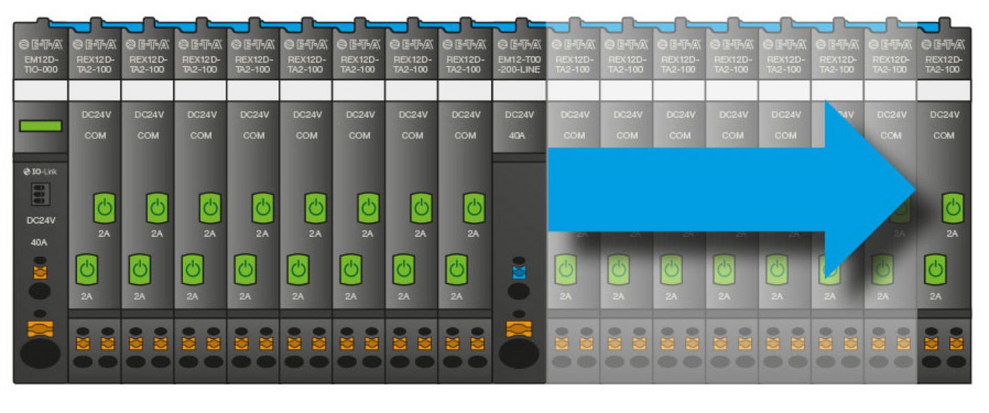 The REX12D intelligent system is ideally adapted to the requirements of machine construction and process control. The compact and modular design, the innovative connection technology and the great number of different devices provide a competitive edge over standard solutions to protect your DC 24 V power distribution.